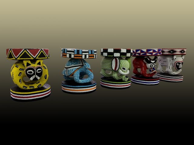 Five beaded wooden sculptures, each with a mirrored wooden plinth and a wooden crate affixed with vinyl pictorial labels