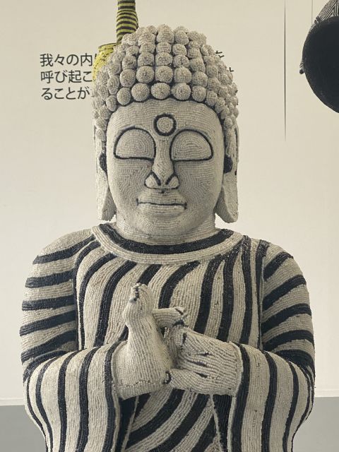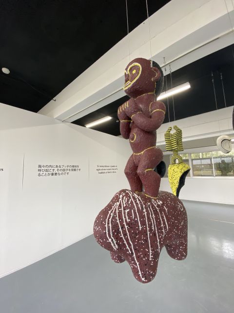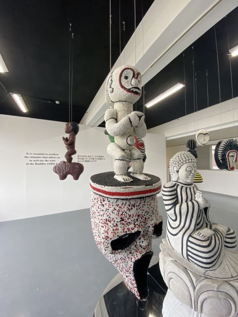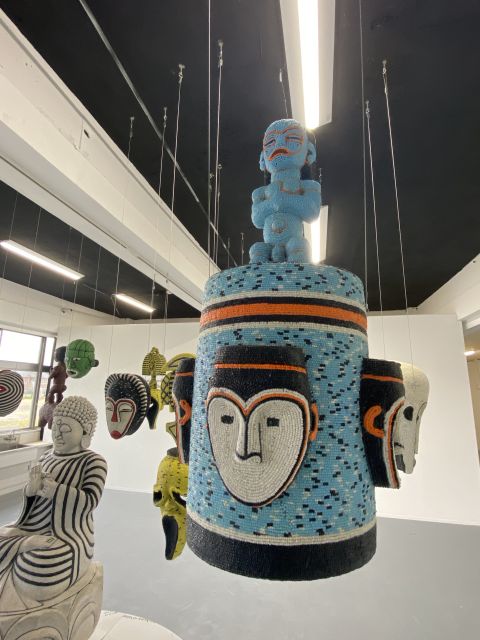 Five beaded wooden sculptures, each with a mirrored wooden plinth and a wooden crate affixed with vinyl pictorial labels(br> Approx. 20m²