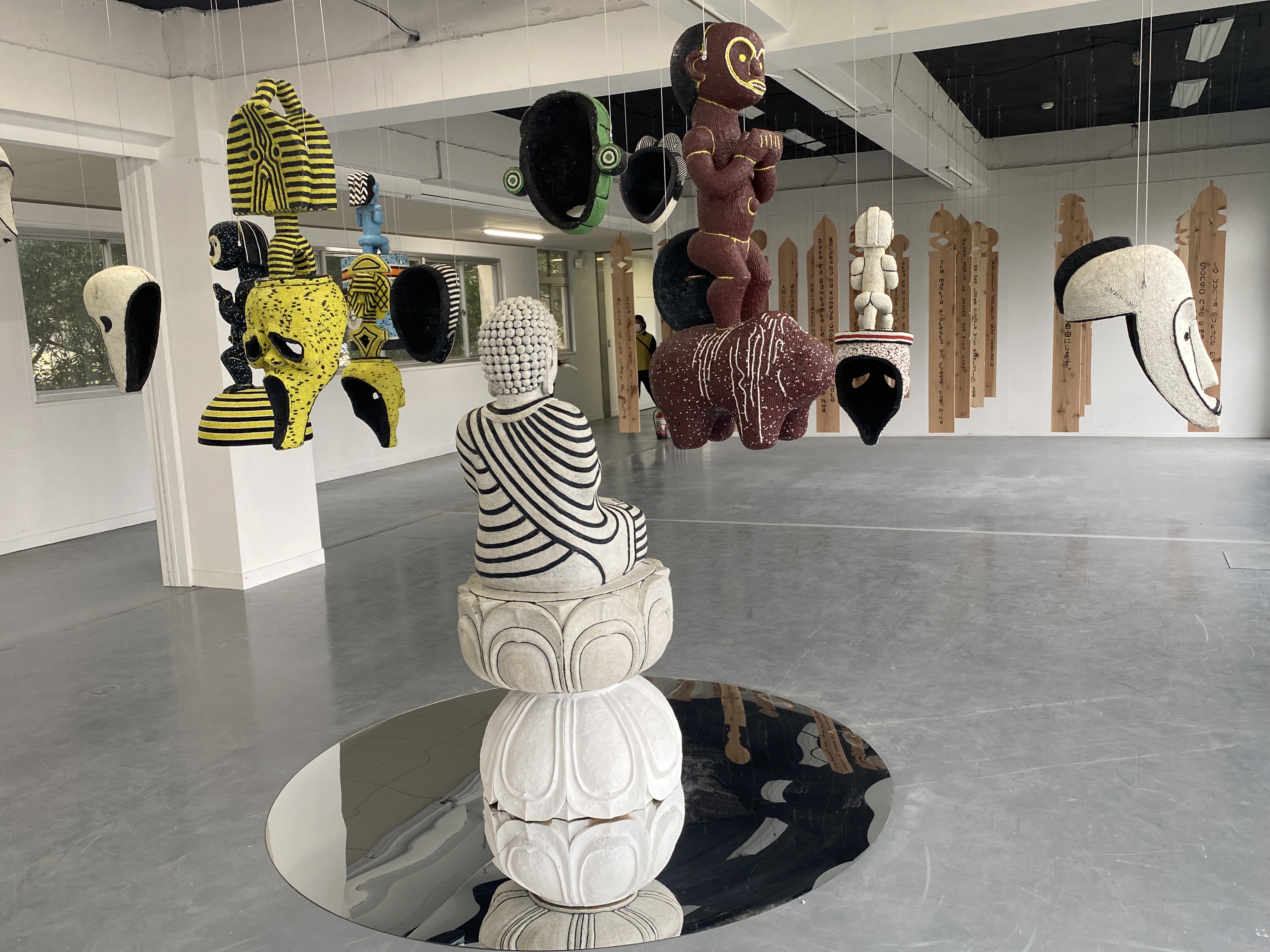 Five beaded wooden sculptures, each with a mirrored wooden plinth and a wooden crate affixed with vinyl pictorial labels(br> Approx. 20m²